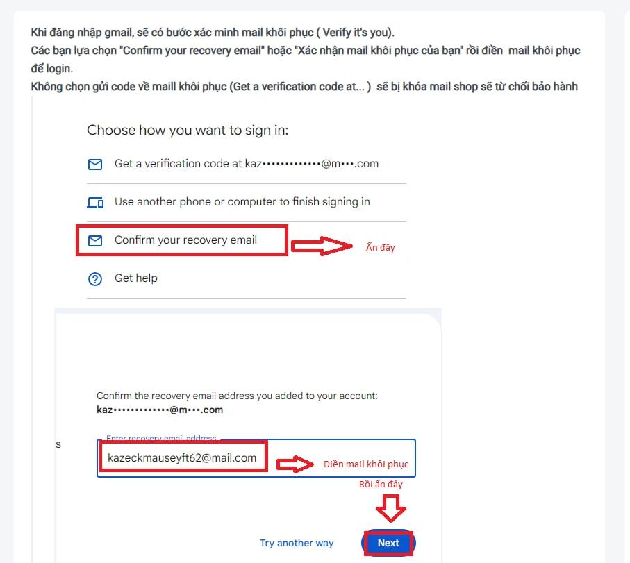 Các bạn lựa chọn "Confirm your recovery email" hoặc "Xác nhận mail khôi phục của bạn" rồi điền mail khôi phục để login.